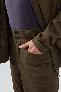 Пояс брюк полностью эластичный, дополнен шлевками. Низ брюк собран на резинку. Два вместительных объемных набедренных кармана на молниях и два кармана у пояса без застежки.
